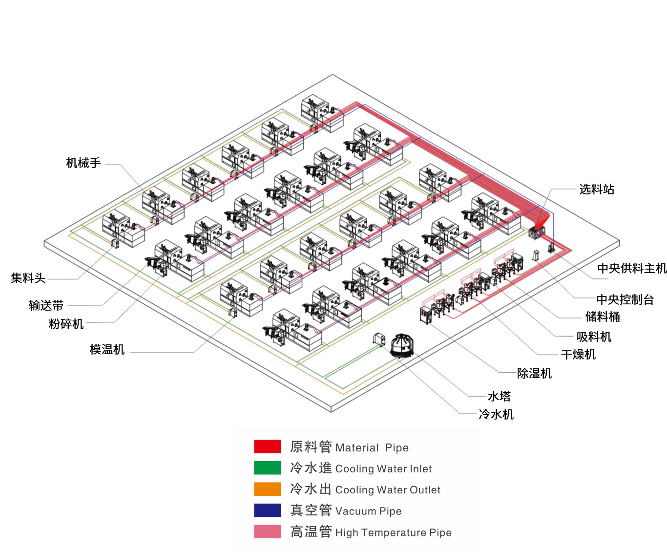 智能工厂规划中央供料心博在线平台(中国)官网流程:原料储料--计量--干燥--输送--使用。中央供料心博在线平台(中国)官网采用工业电脑自动对所有机台进行集中控制,实现了所有用料单元24小时连续不间断供料作业,配合心博在线平台(中国)官网内各机台的不同功能,可以完美实现原料的除湿、干燥、输送、计量、...
