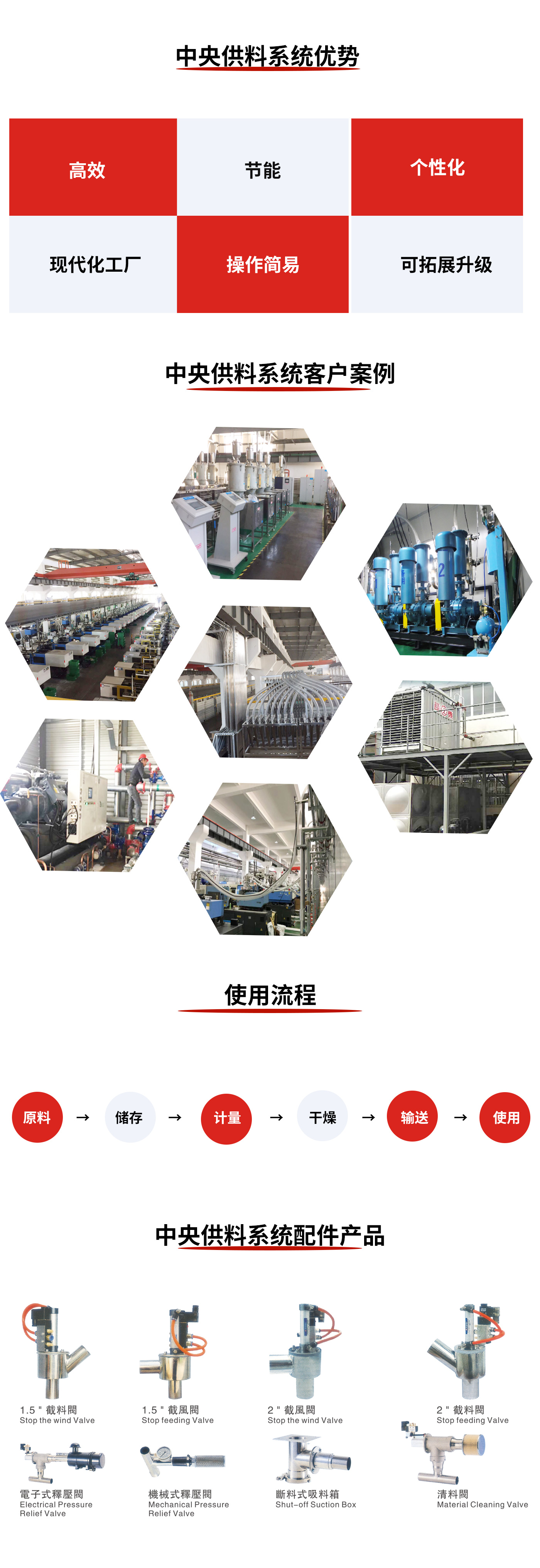 中央供料心博在线平台(中国)官网主要组成部分包括:中央控制站、旋风集尘器、脉动集尘器、原料分配站、储料桶、拌料机、干燥机、除湿机、称重式搅拌机、中央式料斗、粉碎机、机边粉碎机、机械手、截风阀、截料阀、及料管和风管等等。
