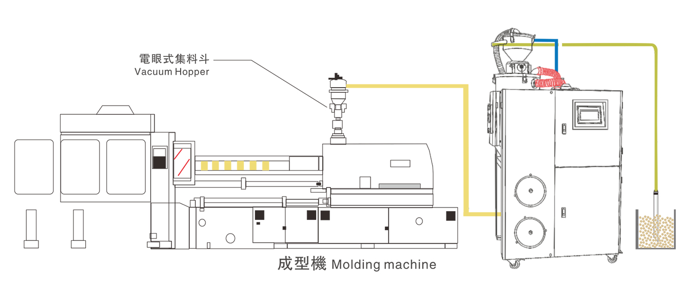 1、除湿干燥机、料斗干燥机及吸料机三机一体,整齐美观不占空间。