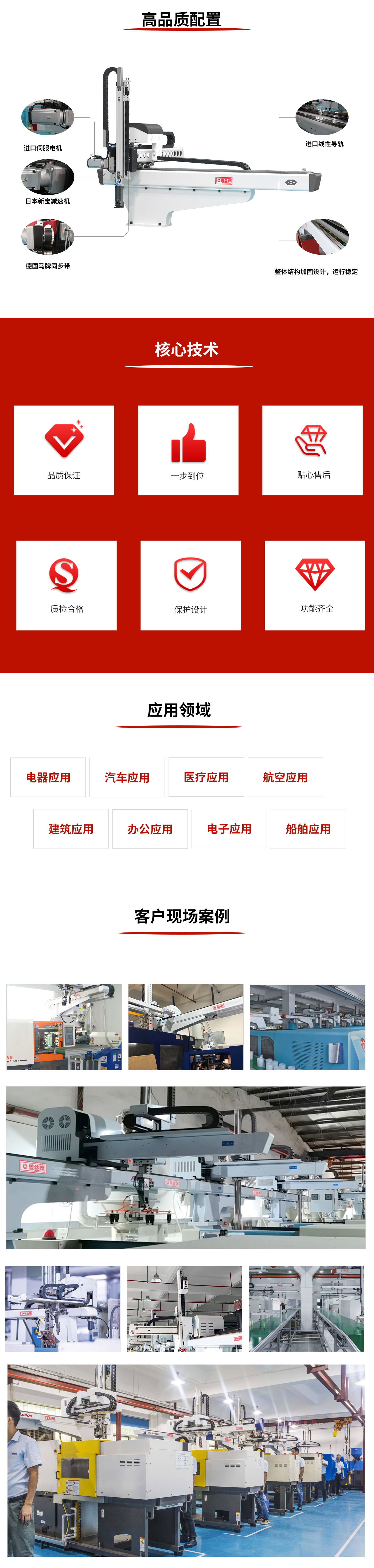 YS大型系列為升放式(牛頭式)機械手,標配為雙截開放式,三軸伺服驅動。伺服驅動優點:調試方便,運行速度快,動作平穩,使用壽命長。雙截式優點:減低機械手的整機高度,動作穩定性好,手臂上下速度快。引拔開放式;主要適用拿取長條型、面積大的塑膠產品(如汽車保險杠,地臺板等)。