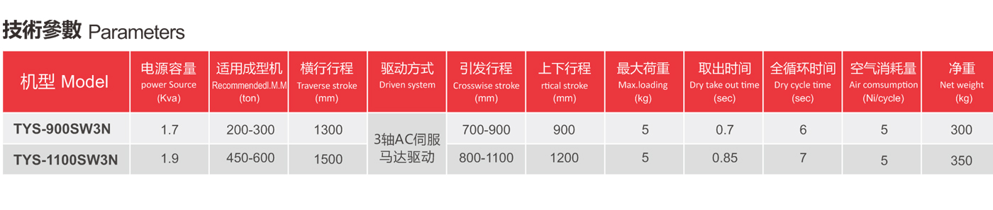 TYS輕型開放式(牛頭式)機械手,標配為雙截開放式,三軸伺服驅動。TYS輕型系列為快速機械手,主要針對一些注塑生產周斯在3-6秒內的產品,如一次性餐盒、刀叉,薄壁包裝產品等。TYS輕型系列機械手最快迴圈週期時間達2.8秒,取物時間達0.6秒,為統益公司主推產品,在行業內具有很大優勢.